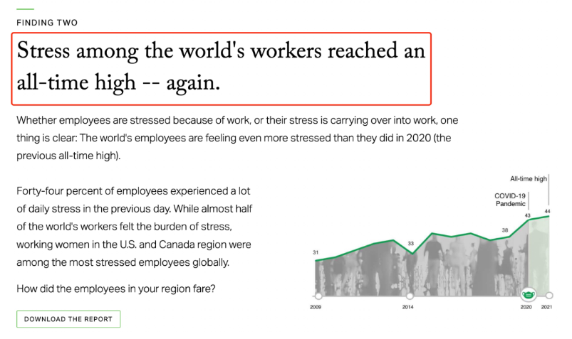 自疫情爆发以来,整个世界就笼罩在病毒的阴霾下。一些国家/地区好不容易在今年决定放松限制,恢复疫情前的生活。但解封后,大家的日子其实并不好过。根据权威民调机构盖洛普的调查发现, 全球员工的压力并没有随着生活秩序的恢复而减少,反而在今年创下新高!