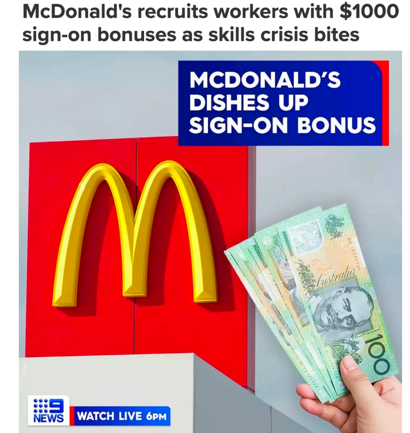 在最近一次招聘活动中,悉尼华人区Chatswood的麦当劳门店就表示,新员工只要每周工作20小时或以上,并且有白班夜班轮替,就能获得1000澳元的入职奖金。