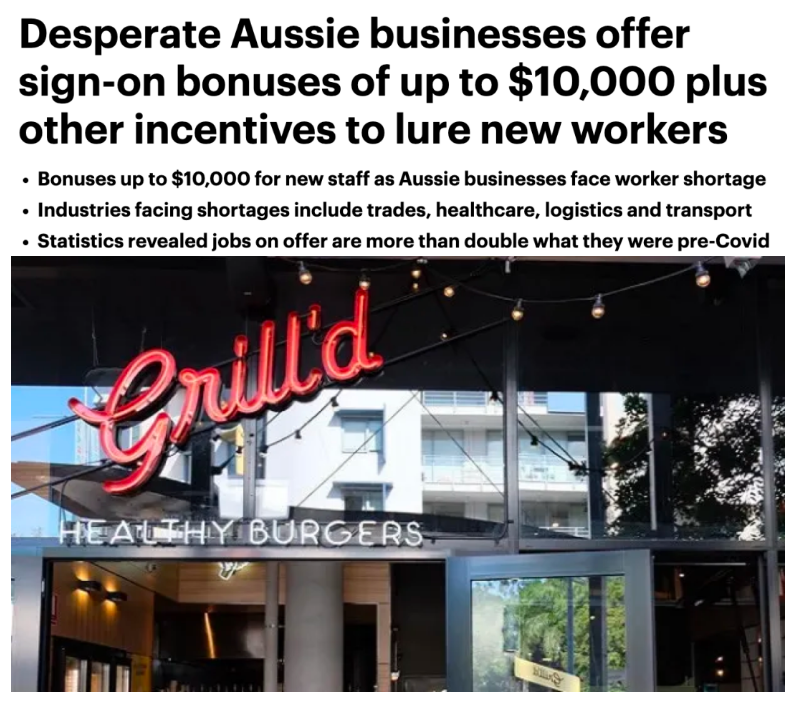 而墨尔本一家餐厅Grill'd franchise直接痛下血本,只要入职,就可以领1万澳元的奖金。