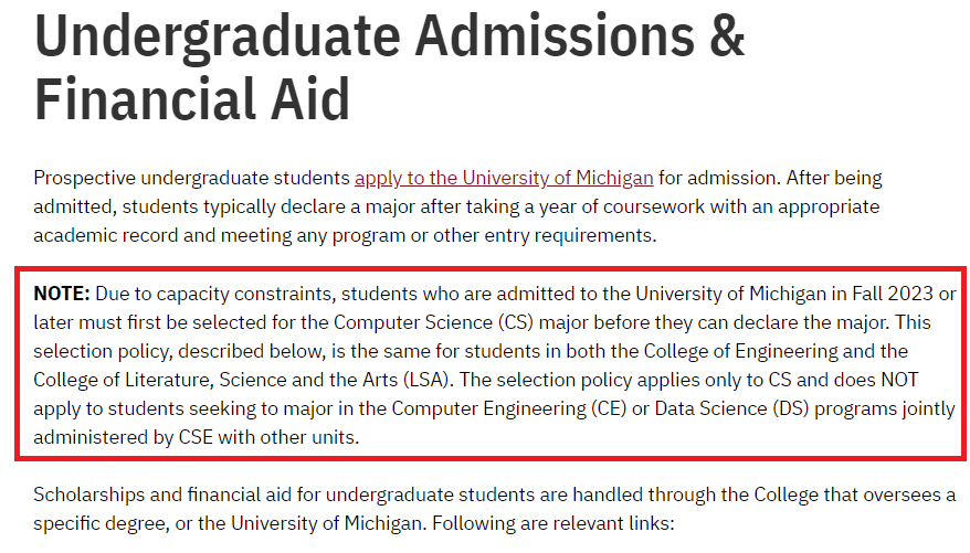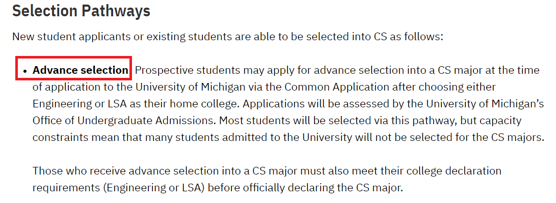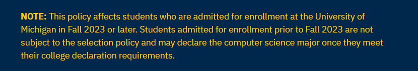 由于班级人数限制,2023年秋季或之后被密歇根大学录取的学生必须先被选为计算机科学(CS)专业,然后才能申报专业。这一政策对于工程学院和文学、科学与艺术学院 (LSA) 的学生都是相同的,政策仅适用于 CS专业,不适用于寻求主修 CSE 与其他交叉学科的计算机工程 (CE) 或数据科学 (DS) 课程的学生。