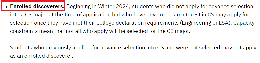 第二种:从 2024 年冬季开始,在申请时未预选 CS 专业,但日后对 CS 专业产生兴趣的学生可以在满足大学专业申报要求(工程或 LSA)后申请。但是,班级人数限制意味着并非所有申请者都能进入 CS 专业。