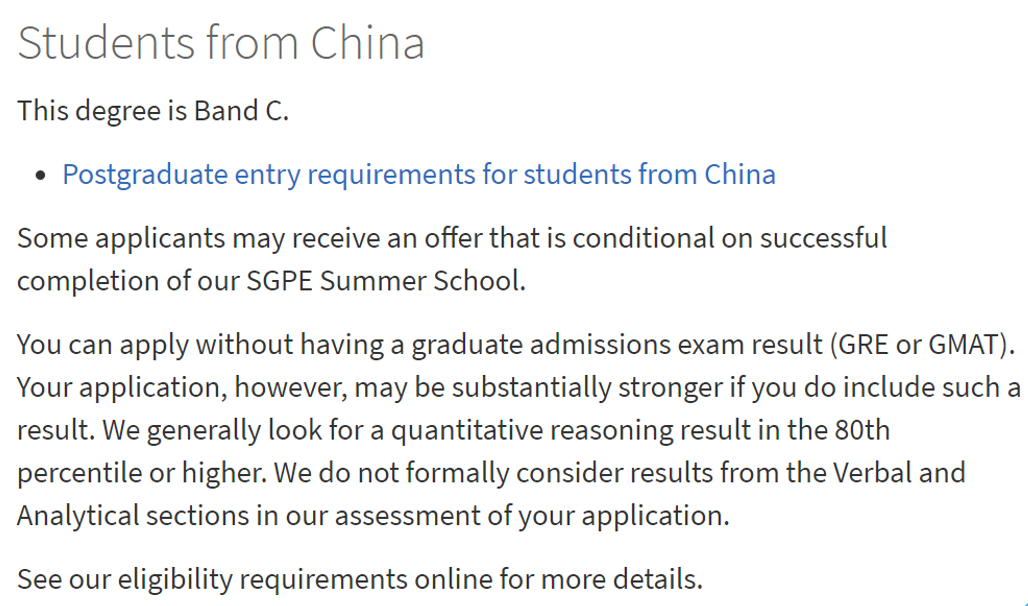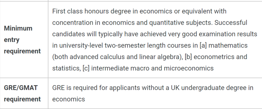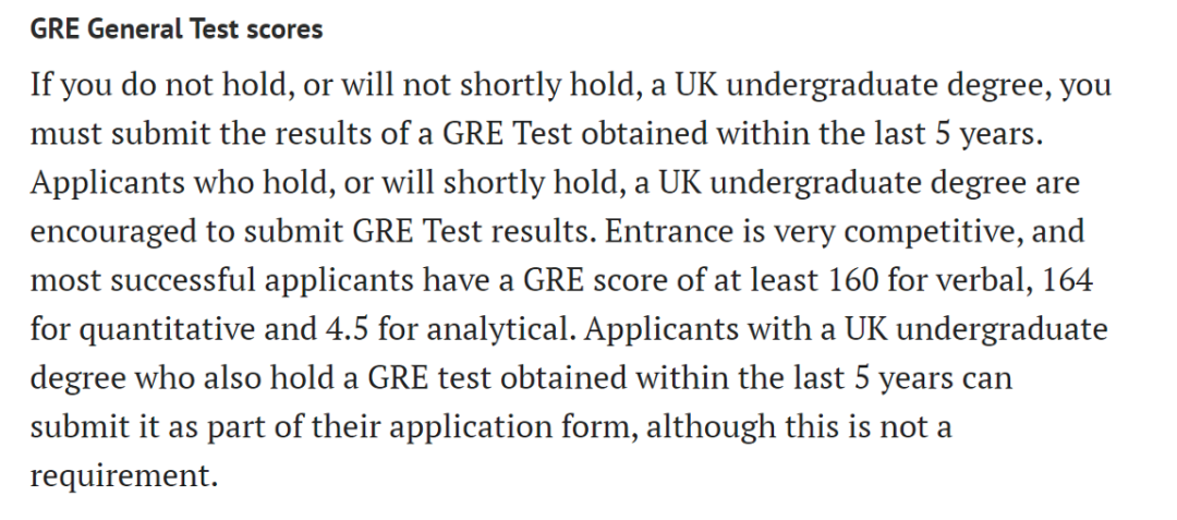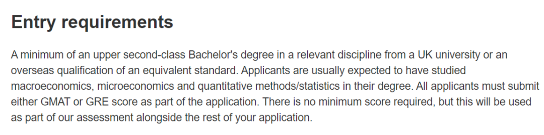 Economics MSc:要求非英本学生提供GRE成绩,所有本科学位完全或主要在英国以外的大学的申请者必须提供GRE成绩,定量分数必须为161+。