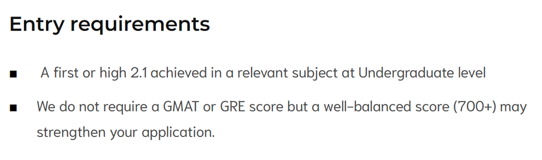 MBA 专业,如果学术成绩不够,可以用GMAT成绩(600+)进行弥补,还有一些硕士专业鼓励提交GRE/GMAT成绩,比如 MSc Mathematical Economics and Econometrics,提到GRE/GMAT成绩将会让申请更有优势。