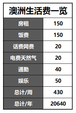 在澳大利亚留学的生活费一般是10-15w人民币。主要集中在房租、饭费、 话 费网费、电费天然气、通勤费用、娱乐等。不同的地区、日常活动、生活质量等因素都会影响生活费用的花销。下面列举了一个在墨尔本地区学校周边合租学生的每周花费清单。小伙伴们可以做个参考:(以澳币计算)