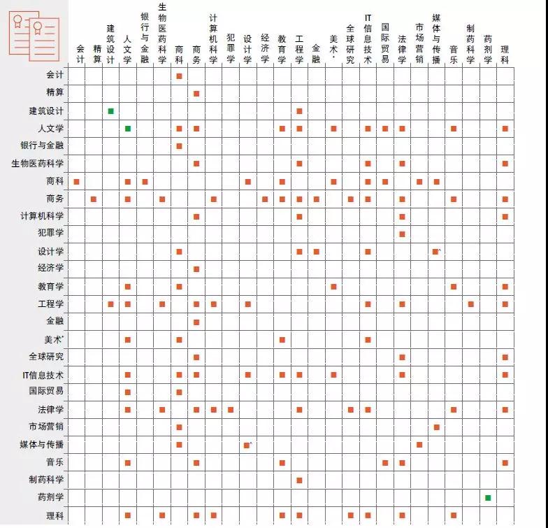 图片源自最新的《 2019 年蒙纳士中文版课程介绍》,所有 橙色的标注 代表着这两个本科专业可以进行双学位课程的搭配, 绿色的标注 则代表本硕连读课程。