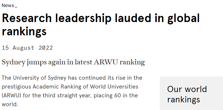 2022 年 8 月 15 日,悉尼大学连续第三年在享有盛誉的世界大学学术排名 (ARWU) 中继续上升,位列世界第 60 位。