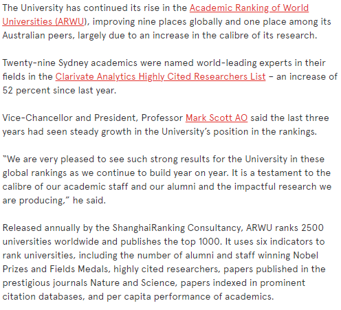 该大学在世界大学学术排名 (ARWU )中继续上升,在全球范围内提高了 9 个名次,在澳大利亚同行中提高了一个名次,这主要是由于其研究水平的提高。
