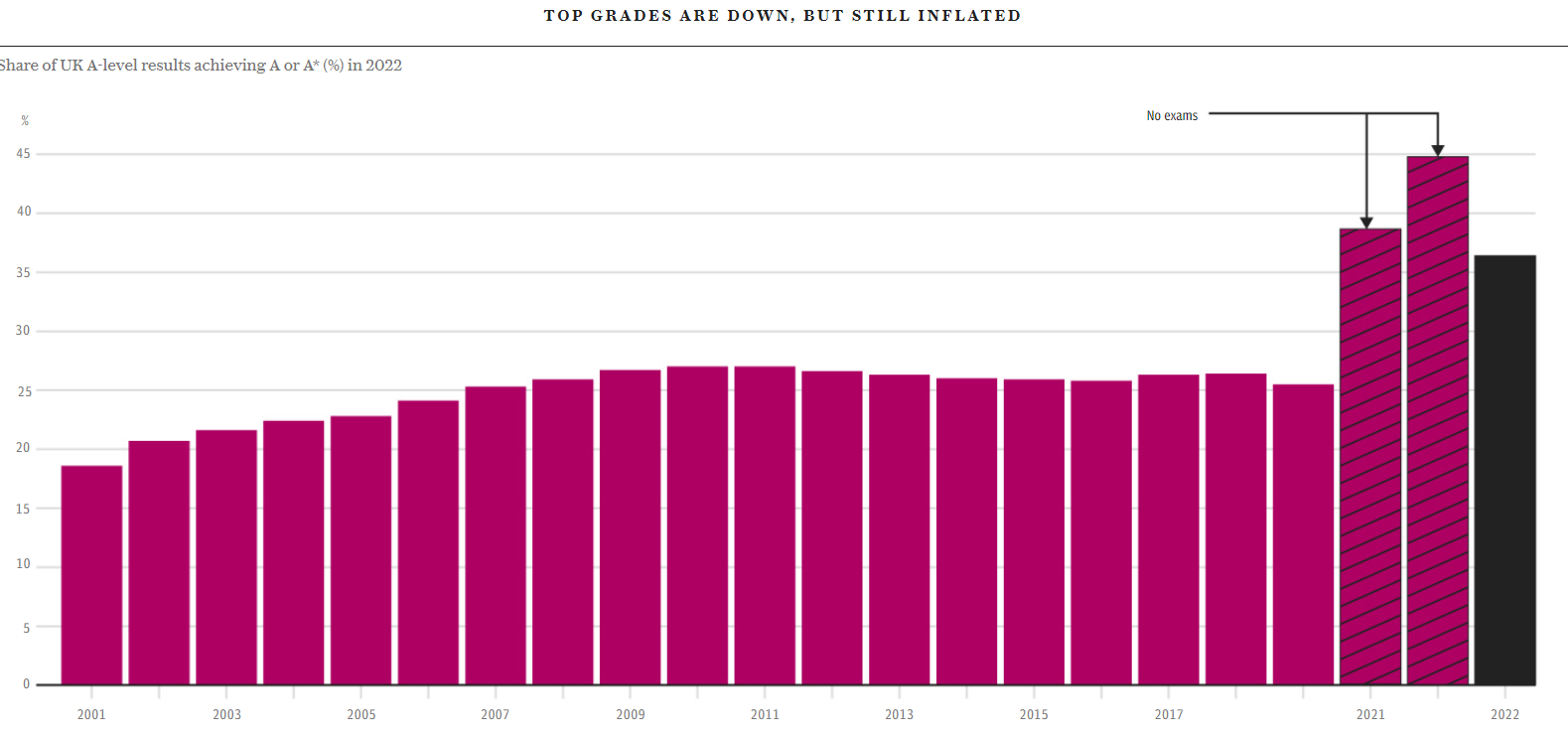 A -A* 的比例从 2021 年的创纪录的 44.8% 下降到 36.4%。不过这一比例仍然高于 2019 年,当年有25.5% 的学生A-Level成绩是 A 或 A*。