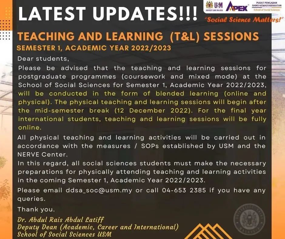 (a) 原则上,所有学生都必须在 2022/2023 学年第一学期返回校园。但是,在专科、本科和研究生学习的前七 (7) 周内,教学活动 (TnL) 可以以混合形式进行。因此,无法返回校园的国际学生可以通过线上形式进行上课。学院/系/中心可以自行决定混合模式下的教学活动机制。