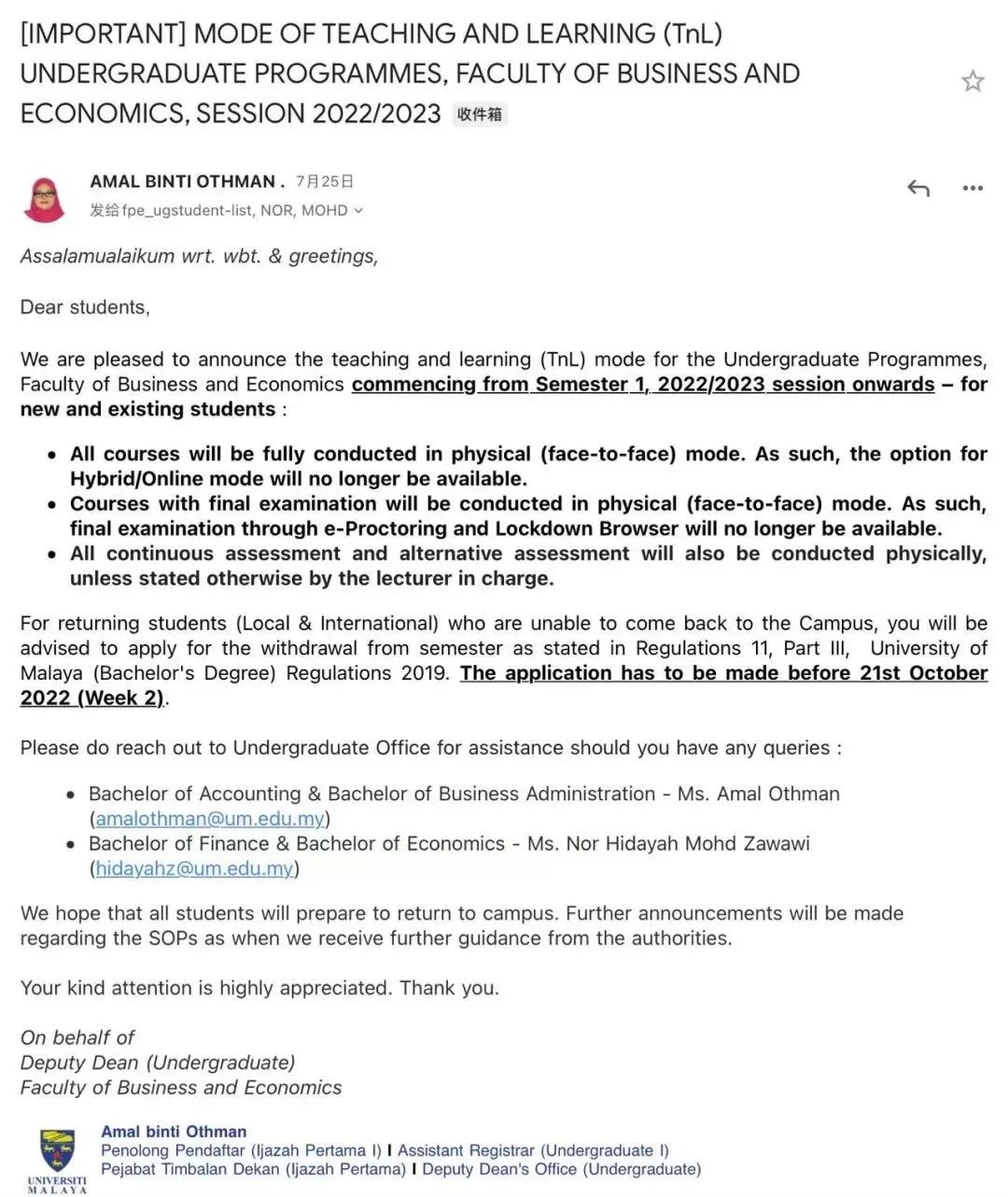 在 7 月马来亚大学商业与经济学院率先发布通知,要求秋季学期全部本科生都必须恢复线下授课。