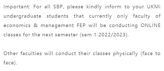 重要提示:对于所有SBP,请通知你的UKMi本科生,目前只有经济与管理学院FEP将在下学期(sem 1 2022/2023)开展在线课程。