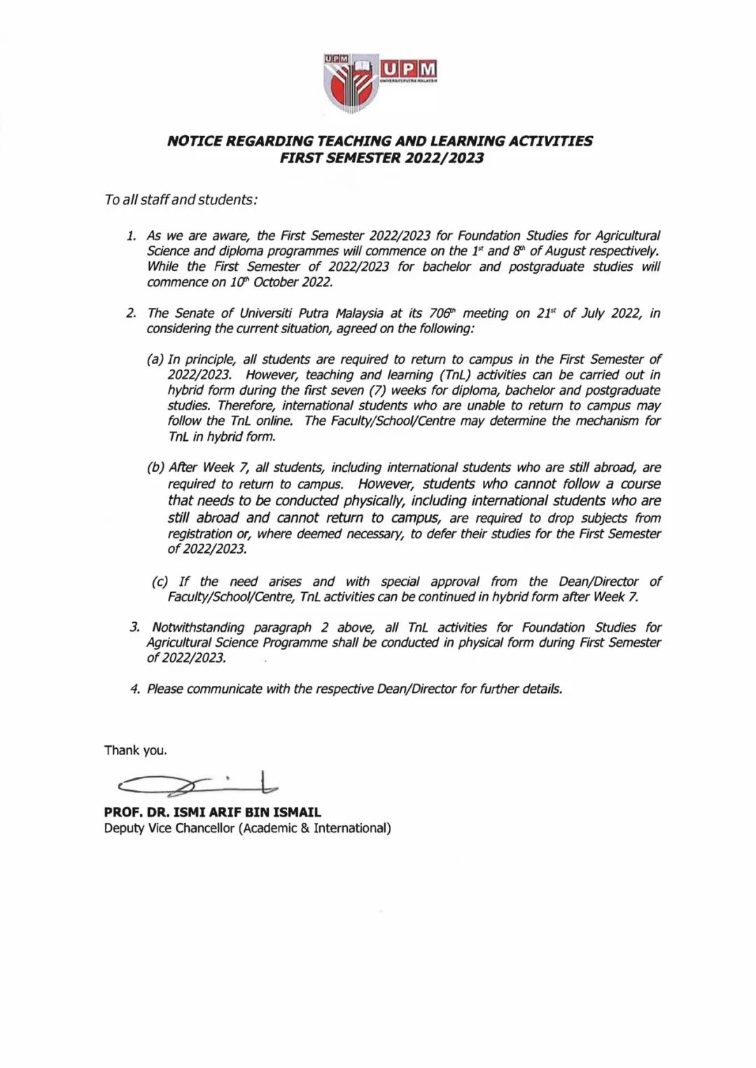(a) 原则上,所有学生都必须在 2022/2023 学年第一学期返回校园。但是,在专科、本科和研究生学习的前七 (7) 周内,教学活动 (TnL) 可以以混合形式进行。因此,无法返回校园的国际学生可以通过线上形式进行上课。学院/系/中心可以自行决定混合模式下的教学活动机制。