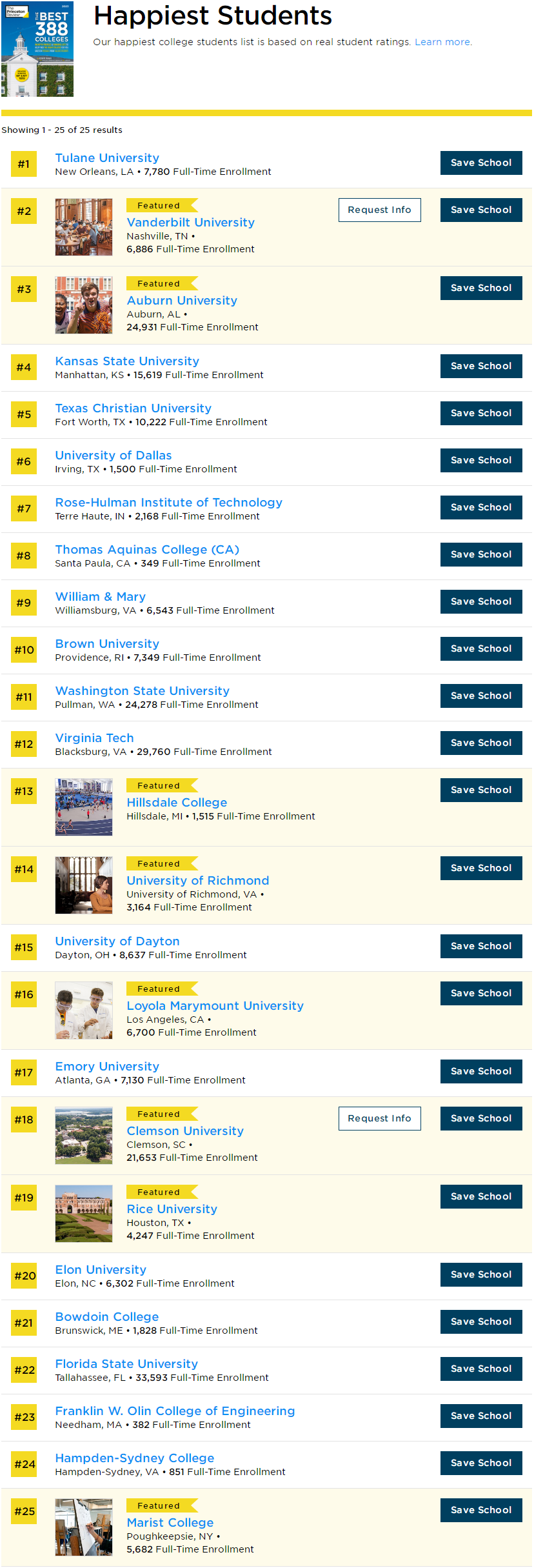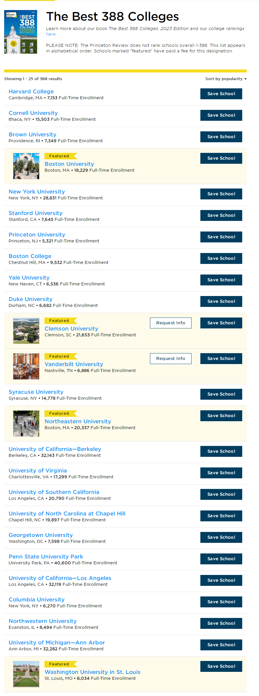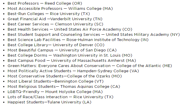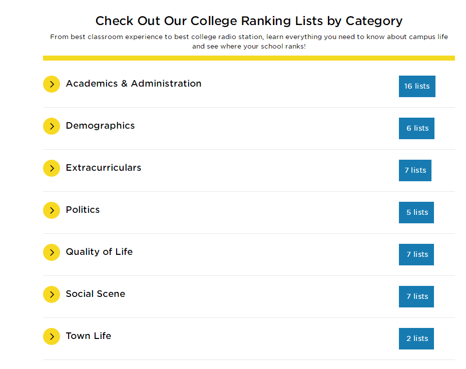 今年,《普林斯顿评论》将名单上的大学数量从 20 个增加到 25 个,并将名单类别的数量从62个减少到 50 个。