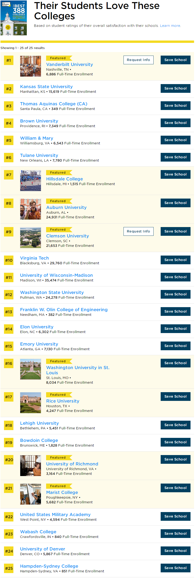 今年是《普林斯顿评论》第31次发布该榜单,基于全美160,000 名学生的调查列出了学术/管理、生活质量、政治、校园生活、城镇生活、课外活动和社交场景等50个类别中TOP25大学。