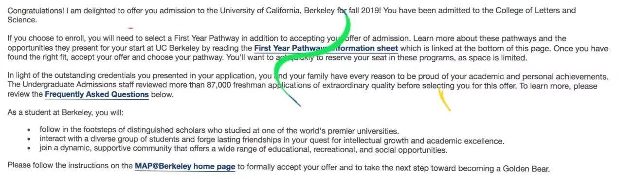 这个学生录取到文理学院,他申请的时候专业兴趣填的是国际关系和政治学,录取信上并没有提及有关专业的内容。