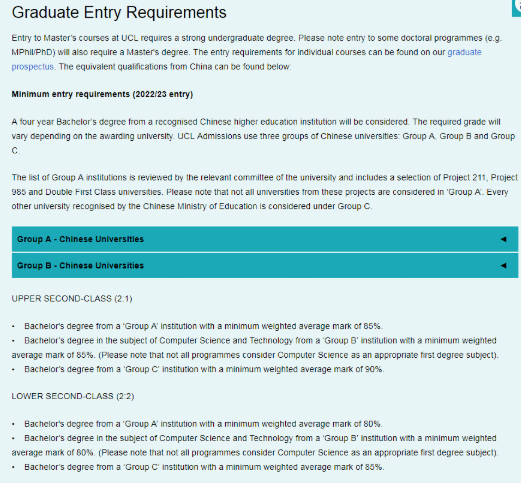 之前UCL给中国院校划分了A/B/C三个档次,GroupA和GroupB主要由985/211和双一流大学构成,其他教育部认可的大学为 GroupC。对不同档次院校的学生,有不同的GPA要求。