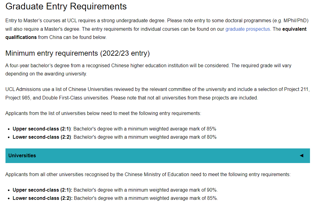 针对中国教育部认可的其他大学(在UCL认可名单之外的大学),入学要求如下: