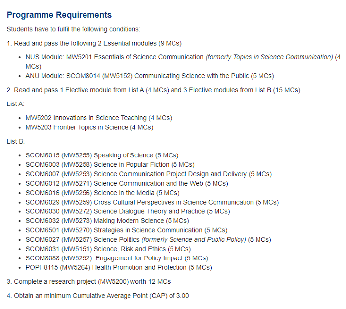 是由澳洲国立大学和NUS联合创办的硕士课程,目前只有春季入学,学习方向会更偏向于公众沟通、研究方法、材料编写以及科学实践方向。
