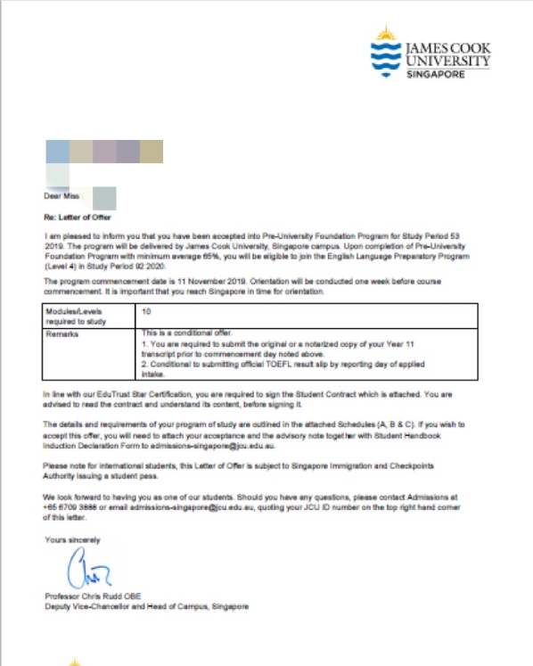 学生家长来咨询的时候是学生高二下学期快结束的时候,因为学生读的是国际高中,高三基本上就没什么课了,所以家长不想让学生继续留在学校耽误时间,所以想提前让学生出国,经过咨询,因为学生是女孩子,所以家长觉得新加坡的环境和安全情况都比较不错,而且澳洲jcu大学在新加坡的直属分校,毕业证和本校是一模一样的,这样学生就不需要飞到澳洲那么远上学,家长也比较放心一些,专业也有学生比较喜欢的幼儿教育专业,所以选定了这所学校,在申请的过程中,因为学生读的是国际高中,所以有提前考出托福成绩70分,这个分数是够申请本科预科的英文要求的,但是因为读的是国际高中所以没有参加国内会考,也无会考成绩,所以在申请的时候在跟校方经过多次沟通后,提供了学生2年的高中成绩进行评估,另外因为学生只有高二结业的 学历,所以最终学校下了本科预科的录取,学生现在已经在新加坡开始了她全新的留学生活,学生反馈不管是这个国家还是学校她都十分满意,觉得比在国内继续读高三要有好的多,很开心当初家长给她做了这样的决定!