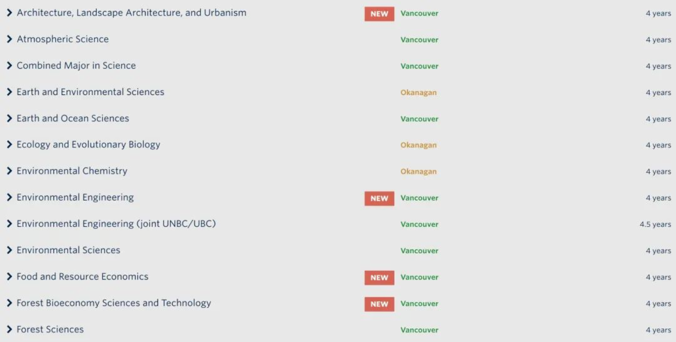 学校的专业列表里,会特地把新专业用“New”来标记,同时也会写出提供该专业的校区。比如下图中的建筑学、景观建筑与都市发展;环境工程;食物与能源经济;森林科学等。
