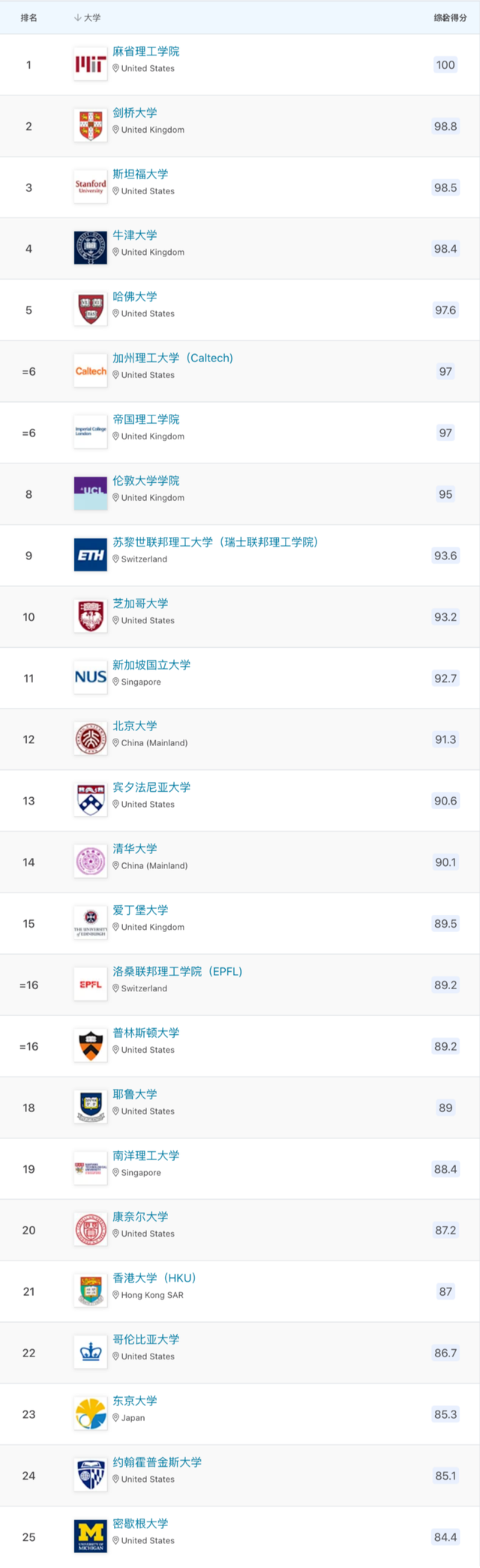斯坦福大学、牛津大学、哈佛大学分列3-5名