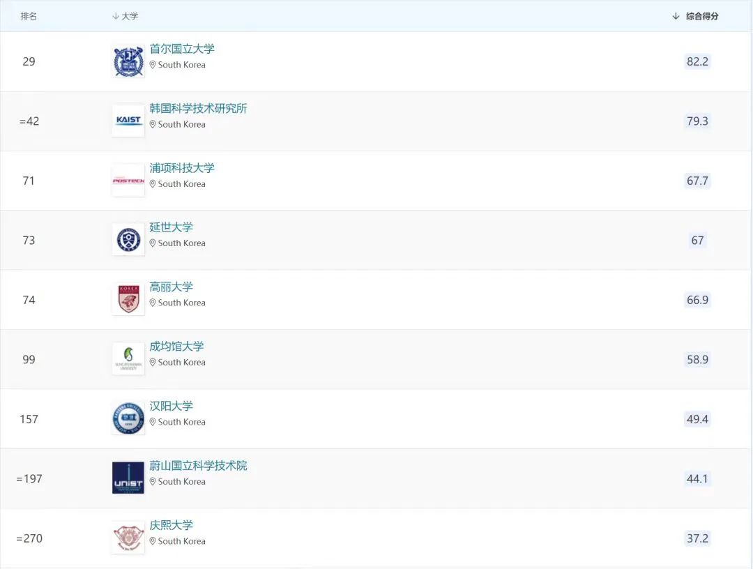 我们先来看一下2022年QS世界大学排名中韩国院校的表现情况。