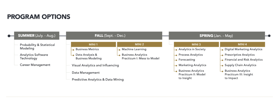 该项目 时长为10个月 ,课程 重点培养学生的分析方法和编程能力 ,应用在各个商业领域。学生需要在3个学期完成37个学分。第一个学期是暑期学期,最后一个学期是来年的春季学期,即5月份毕业。暑期学期开始前建议学生 先参与为期5天的编程训练营 ,为暑期学期编程语言的全面学习做好准备,课程涵盖概率和统计建模,分析软件和职业生涯管理。