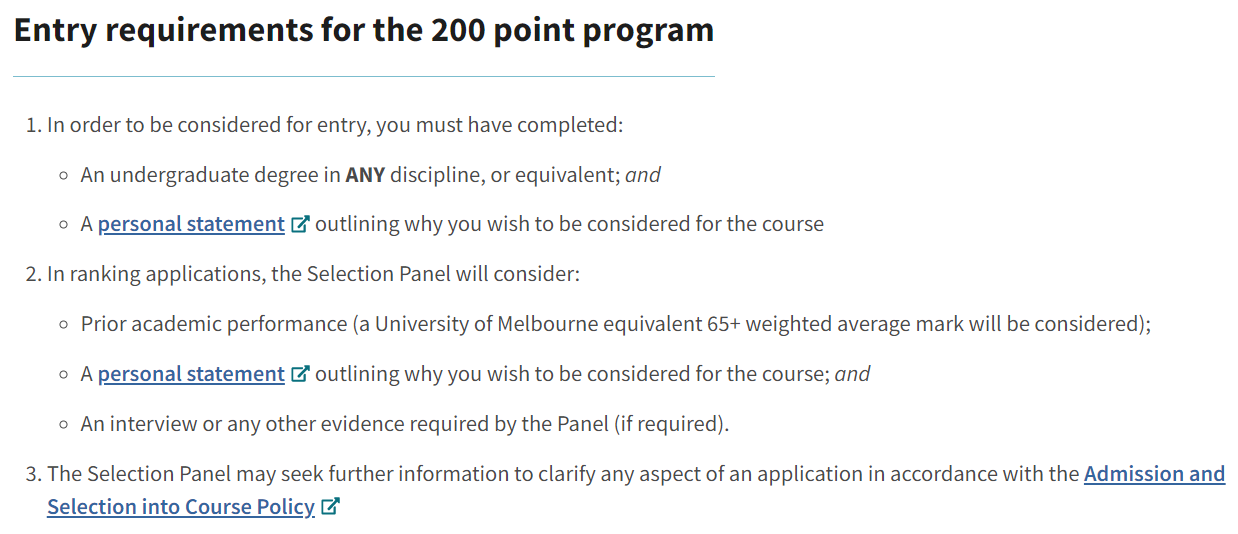 学术成绩: 我们以墨尔本大学的硕士申请的要求为例。首先需要学生具备大学本科的教育背景,并且需要提交个人陈述以展示自己的学术能力以及继续深造的意愿。在申请提交时,由于墨尔本大学允许学生提前一年进行申请。所以学生只需要向校方递交国内大学本科的在读证明以及现阶段(六个学期)成绩单。