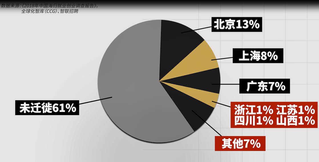 与国内普通大学生源不同,海归群体的生源地本来就集中在东部沿海以及省会城市等发达地区,所以2018年的调查显示,有6成海归回到了家乡找工作。此外, 北京、上海、广东,是海归最主要的流入地,而东北地区和中西部地区是海归人才的流出地 ,这其实和国内双一流建设高校毕业生的地域选择差不多。