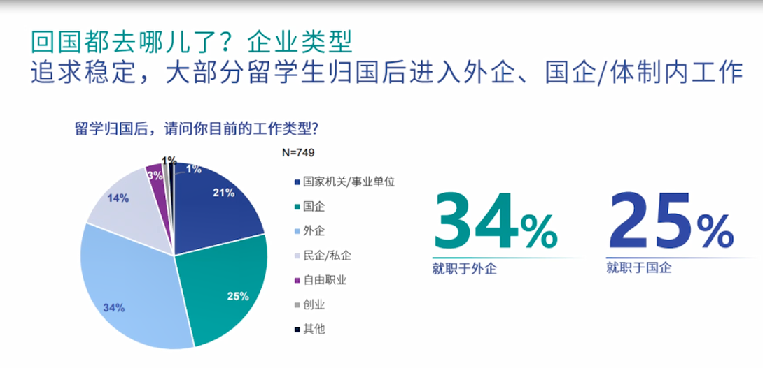 《2020海外留学趋势报告》抽样调查了近千名高学历海归留学生,其中有三分之一去了外企工作,有四分之一进了国企,有五分之一进了国家机关和事业单位。