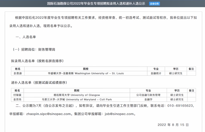 能发挥海归优势的企业和岗位,招聘海归的比例都不低。我查到一家代表中石化对外进行油气合作的子公司——国际石油勘探开发公司,2022年该公司校招的新员工全是海归;还有类似性质的国家电网旗下的国网国际发展公司,公示的20人录用名单里,有12个有留学经历。