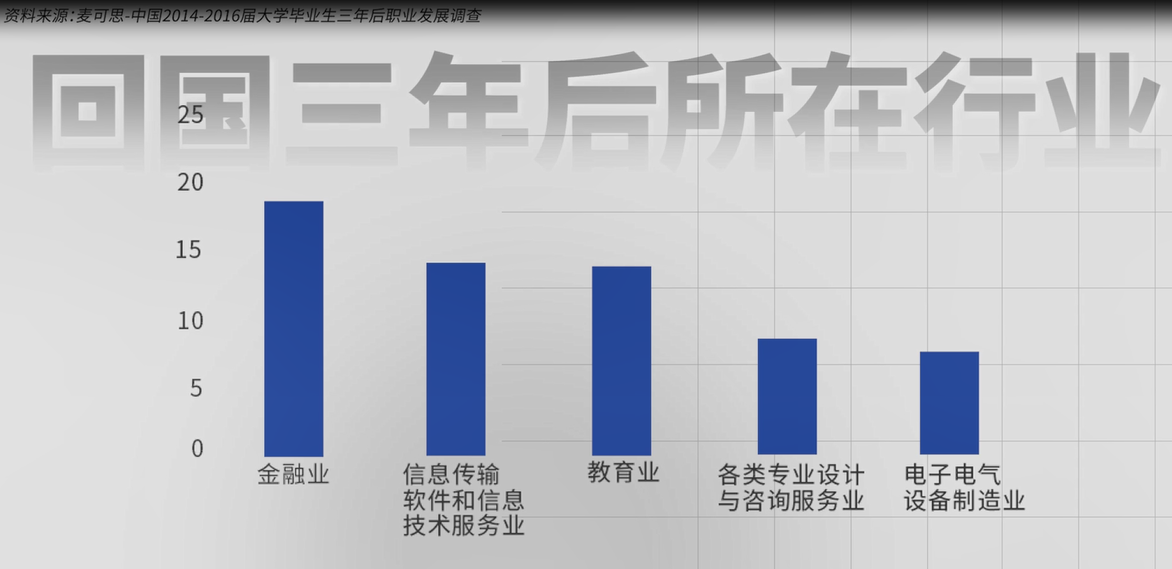 麦可思研究院追踪调查了留学生回国三年后所在的行业分布,发现 排名靠前的依次是金融业、信息软件业、教育业、设计和咨询等高端服务业以及电子电气设备制造业 。