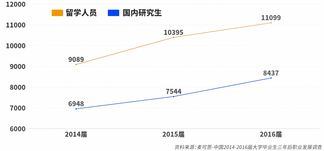 和国内研究生相比,同样是毕业后三年,留学生的平均收入要高2500元左右 ,比方说2016年毕业或留学归国的这一届学生,3年后国内研究生的平均工资大约是8500,留学生大约是11000。