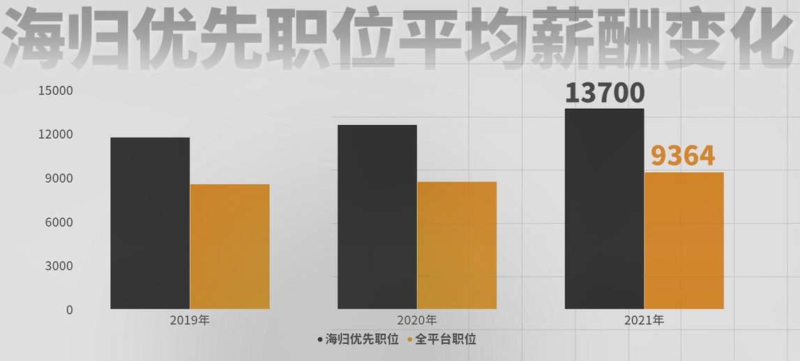 当然,既然是平均值肯定就有高有低。不过有一个明确的趋势,就是招聘网站上那些标注了海归优先的岗位,近几年的薪酬增幅比其他岗位更大。根据智联招聘的统计,2021年海归优先岗位的平均薪酬达到了13700元,比其他岗位平均薪酬高了将近4500元,而且这两类岗位之间薪酬的差距最近几年也是越拉越大的。