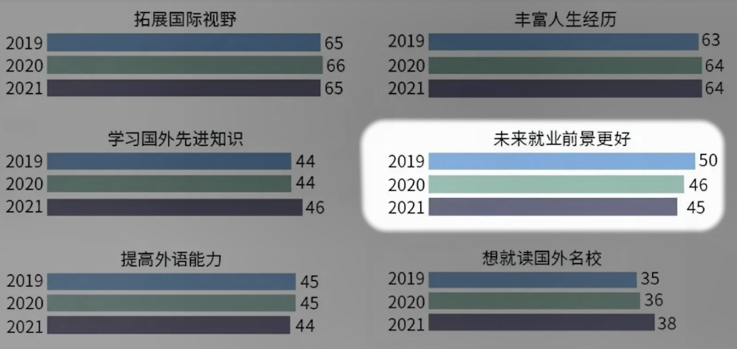 这也让不少出国留学的学生转变了心态,在《2021年度全国留学报告》中,认为出国留学可以“带来更好就业前景”的人群比例明显下降了。