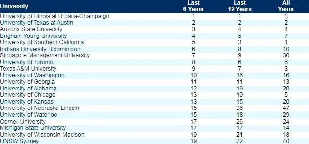 杨百翰大学的研究人员衡量世界上所有机构的会计学者的智力贡献。他们通过在顶级同行评议的会计期刊上发表的文章,并根据出版物的数量对最近几年的部门或学校进行排名。