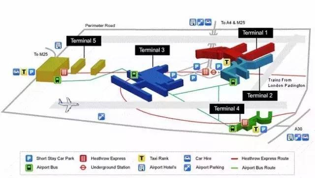 伦敦希思罗国际机场一共有五大航站楼,分别是 T1 、 T2 、 T3 、 T4 、 T5 航站楼,因此在预订好机票后,除了要确定降到英国的哪个城市,如果是伦敦还要确定降到哪个机场(伦敦有五大机场),更具体的还要确定哪个航站楼,因为不同航站楼的交通方式是完全不一样的,尤其是有接机服务的,一定要准确告知对方几号航站楼。如上图所示,其中 T1 、 T2 、 T3 号航站楼是连在一起的,位于机场中心, T4 号和 T5 号航站楼是单独分开的,设有独立入口,分别位于机场南部和西部。从中国前往伦敦的航班一般会降落在 T3 、 T4 、 T5 航站楼,如果从其他国家中转的也可能会降落在 T1 或者 T2 航站楼,甚至伦敦的其他机场。