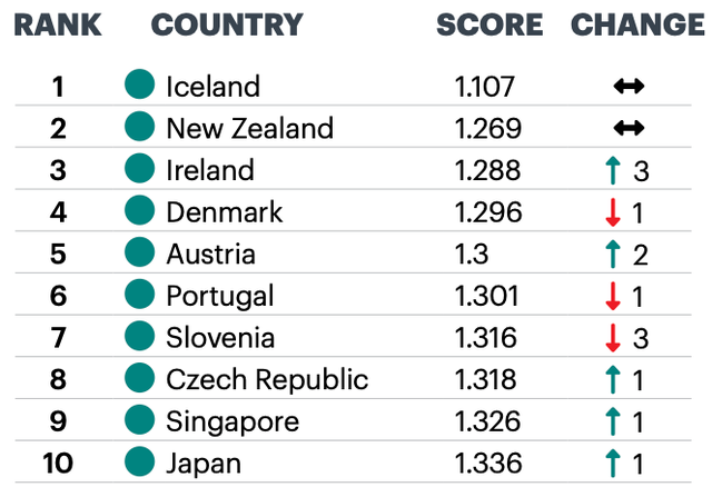 欧洲有四个国家进入全球最安全前五。爱尔兰是全球最安全前十名中上升最快的国家。爱尔兰的排名连升四位,由去年的全球第七荣升今年全球第三。