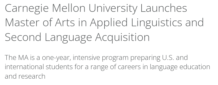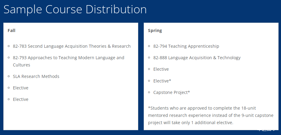 该项目有full-time和part-time两个模式可选, full-time时长为一年 。该项目为学生提供多达 9种 语言,包括: 英语、中文、法语、德语、意大利语、日语、俄语、西班牙语和阿拉伯语 。学生可以选择其中一种作为其学习、研究以及将来教学的语言。选择英语的同学,将有机会获得一个 TESOL证书 。对于想申请英语教育(TESOL)的同学来说,该项目完成可以作为一个TESOL项目来申请。