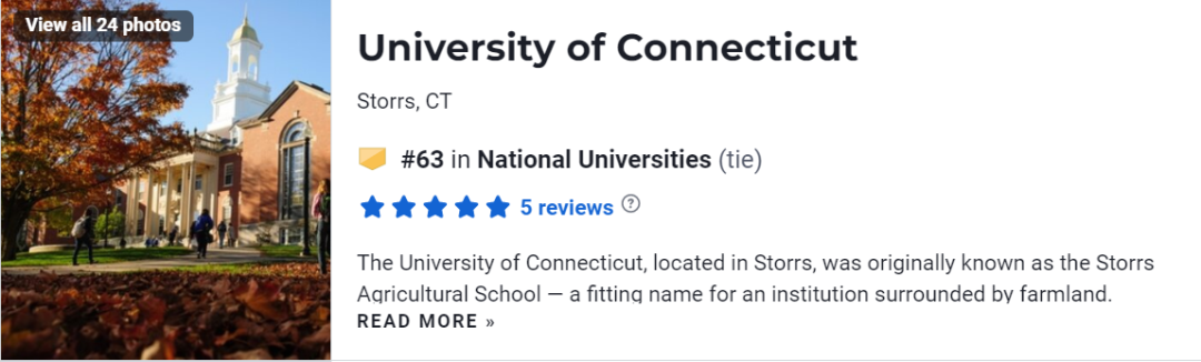 康涅狄格大学 (University of Connecticut,简称UCONN),是一所美国著名、世界顶尖的公立研究型大学。该校创建于1881年,位于被誉为“世界保险之都”的美国康涅狄格州,该州被评为美国最富有和安全的州之一。 该校 连续11年被评选为美国新英格兰地区最顶尖的大学之一 ,同时也是卡耐基基金会指定的美国一级研究型公立大学,“公立常春藤” 院校之一。 学校位列 2022年U.S. News美国大学排名全美第63名 , 美国公立大学第23名 ,其学术声誉在州内仅次于耶鲁大学。