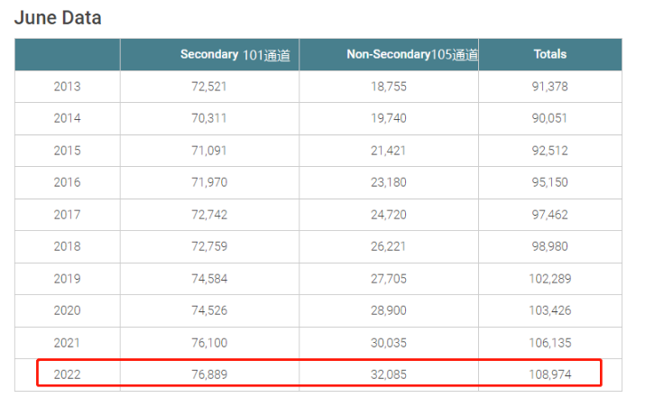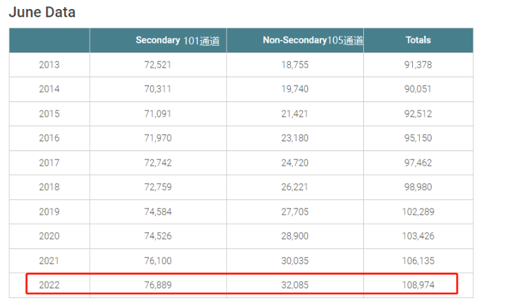 2022年101+105通道 总申请人有163538人,其中92400人来自安省101通道,71138人来自外省和外国的105通道(105通道还包括了一些大学转学生)。