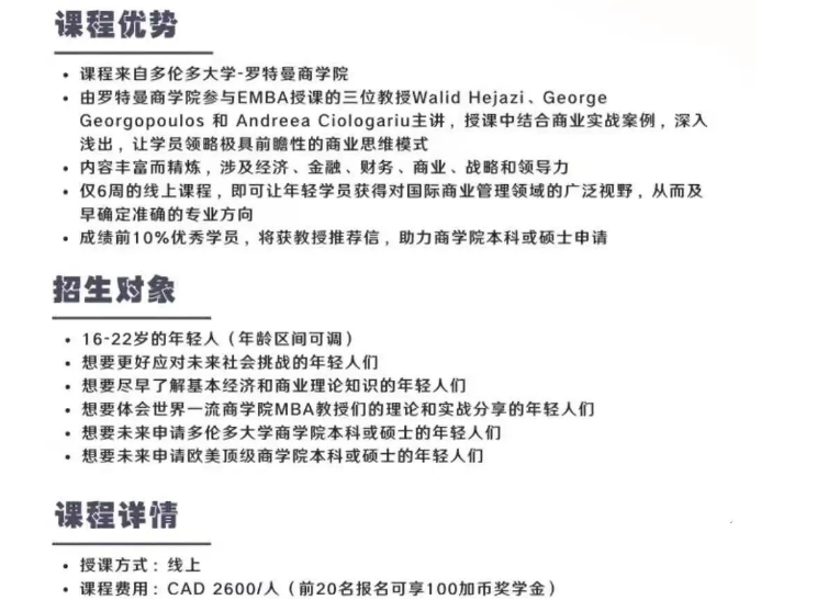 如果你11年级或者12年级才来,没有特别多的机会去参加各种类型的活动,那你可以考虑多伦多大学罗德曼商学院暑假推出的夏校Youth MBA: