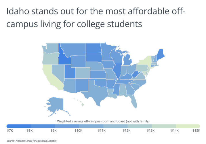 在美国生活成本最高的州,包括加利福尼亚、夏威夷和纽约,校外食宿的平均成本最高。相比之下,犹他州、爱达荷州和缅因州等则成本相对较低。
