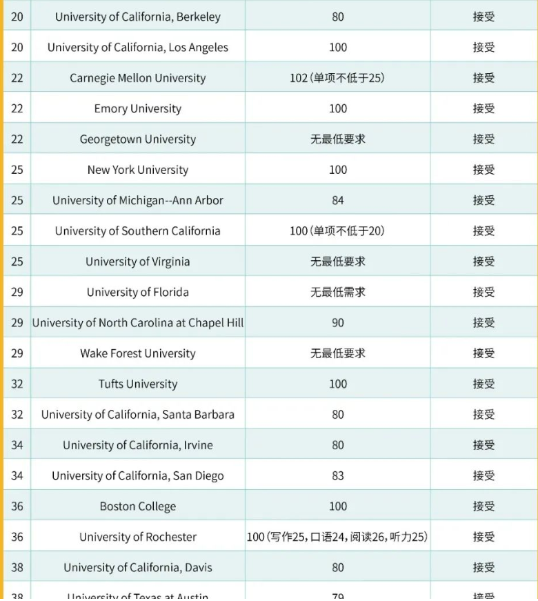 全美TOP100托福要求及在家考认可度
