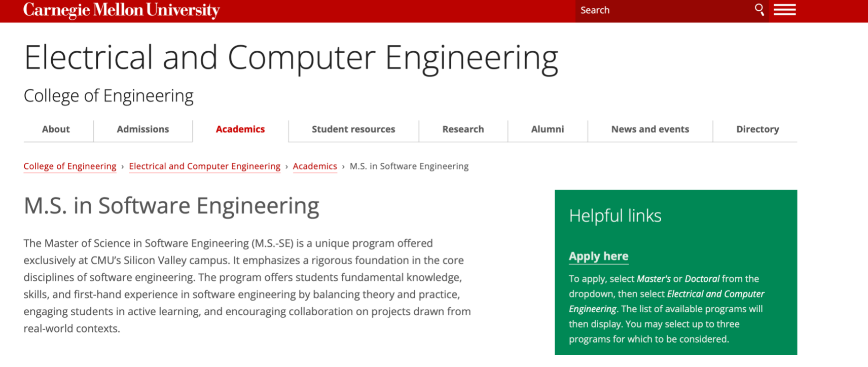 让我们以卡耐基梅隆大学为例深入展开 。 众所周知 ,卡耐基梅隆大学计算机学院是美国最为著名计算机学院之一,学术声誉常年居美国前列,卡耐基梅隆也是少数设有单独的计算机学院的学校之一。 卡耐基梅隆的软件工程专业开设专业有软件工程基础 , 软件构架和设计 , 软件验证和测试 , 软件工程师的决策分析和工程经济学 , 软件要求和交互设计 , 软件工程方法 , 软件重构 软件工程数据科学等课程 。 其 授课地点仅限硅谷 校区 ,为毕业生和在校生创造了最佳的就业和实习条件,世界巨头:谷歌、苹果、facebook、微软、IBM等均位于此。学生可在暑期申请实习。