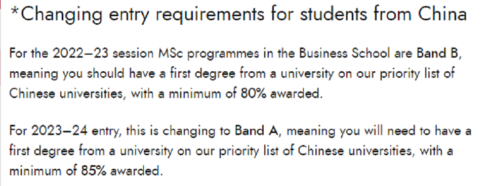 爱丁堡大学商学院硕士面向来自中国大陆学生的录取要求有以下改变: