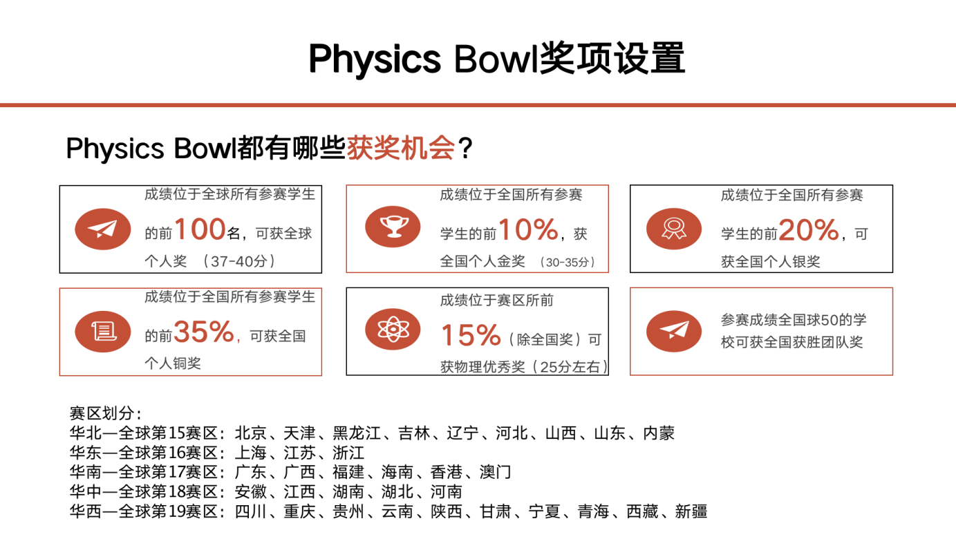 高二,高三学生(IB11-12年级,A-Level AS和A2年级)选择Division 2考题(高二高三的学生不可以报考Division1)。 考试规则报名开始时间:每年 11 月底比赛时长: 45 分钟比赛语言:英文比赛方式:个人比赛,试卷笔试,没有实验考试题型共 40 道选择题,每题一分,答错不扣分比赛结束后 6 周内公布结果 物理碗奖项设置: