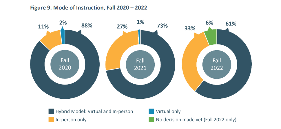大多数人预计将在2022/23学年回到国外亲自学习。 截至2022年夏天,89%的只提供线下或者混合模式。这一比例在2022年秋季上升到91%,在2023年春季保持在89%。