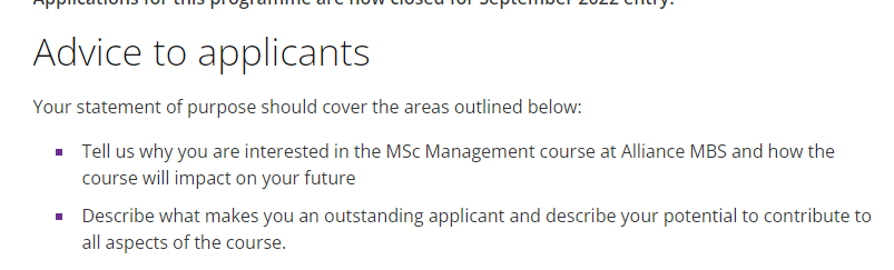 曼大的管理学硕士(MSc Management)在官网要求要上就指出,申请文书建议包含以下内容: