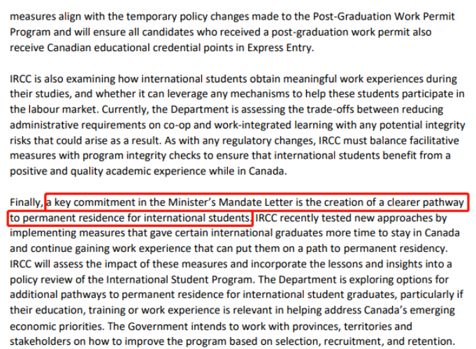 移民部的工作重点是如何帮助国际学生在学习期间获得有意义的工作经验,并帮助他们进入劳动力市场。移民部长宣布的一项重要承诺是为国际学生获得永久居留权创造一条更清晰的道路。